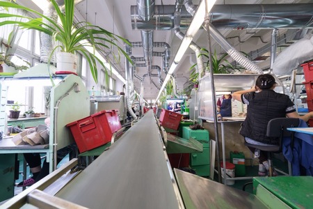 Shoe factory. Female worker on a sewing machine.