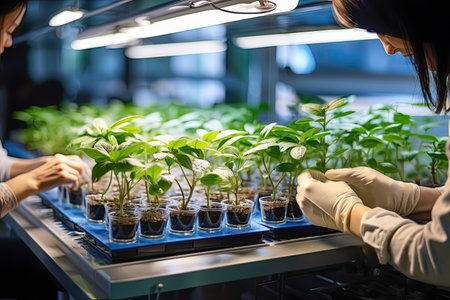 Biology laboratory plants, plants science in lab. Growing plants under sterile conditions. Micropropagation of flowers and trees in the laboratory under artificial lighting.AI generated