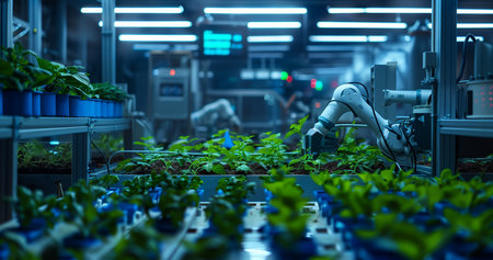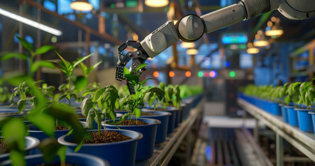 A modern robotic hand carefully tending to young plants in a high-tech greenhouse. This image illustrates the merging of technology and agriculture for sustainable growth.