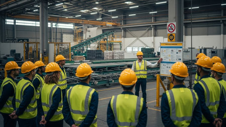 Group of workers all wearing protective earmuffs and helmets during a training session in a loud environment
