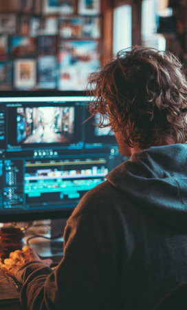 Young man using professional software for video editing on a desktop computer