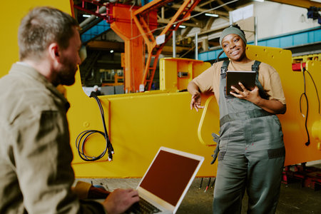 Cheerful young Black female engineer holding digital tablet standing against part of industrial machine talking to her Caucasian male colleague
