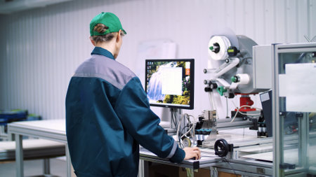 Male worker using computers at manufacturing plant