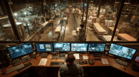 An overhead view of an industrial control room highlights a worker monitoring various screens displaying factory operations. The busy factory layout showcases efficient production.