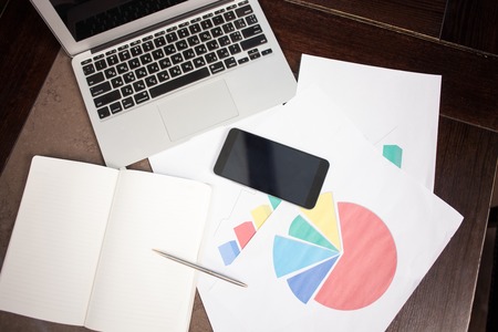 Laptop with graphs and charts. Business plan, financial analytics, statistics. Top view