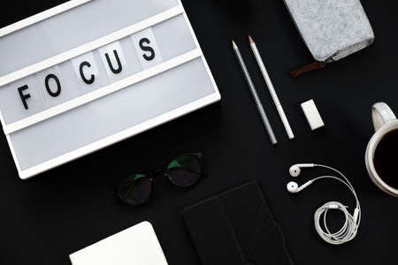 Minimal Black office table desk. Workspace with diary, plant, headphones, pencils, table with the word focus. Flat lay, top view