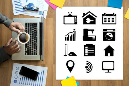 Smartphone and a cup of coffee put at the front of laptop computer with full of document paper with Asian man reading a company plan on background at home office.