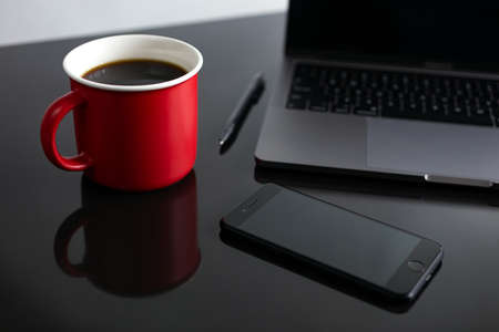 Stylish red coffee cup, phone and laptop on desk table. Black background, business concept, close up