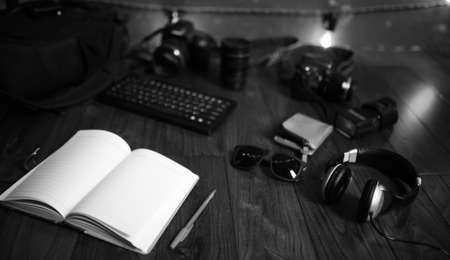 front view working table photographer, glasses, black tablet, camera, waterproof case, headphones and white charger, black background