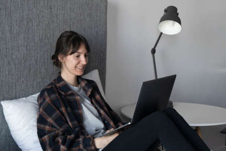 A young woman sits on the bed and smiling at home and pleasantly communicates with friends and relatives or spends time watching a movie. Lifestyle .