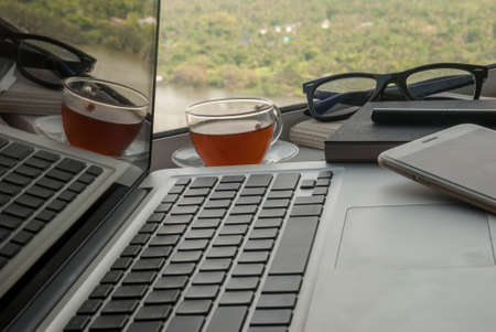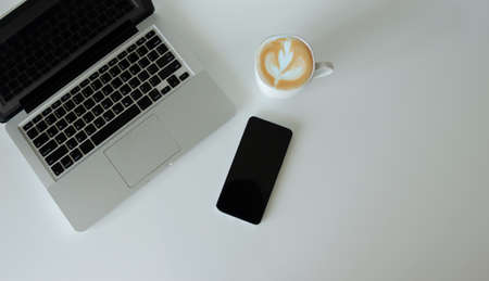 cup of coffee in Working place office desk with smart phone, laptop on wooden background.