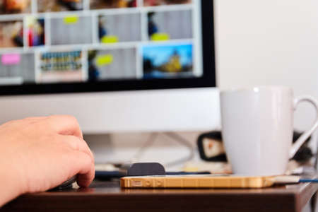 Cropped shot of female freelancer typing on mock-up laptop in modern home office with camera and other supplies