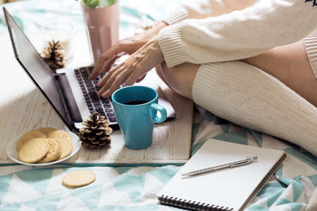 Cropped shot of young female freelancer typing on laptop computer while sitting next to the windows with a cup of hot cocoa