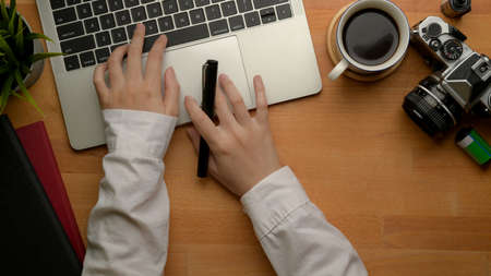 Overhead shot of female photographer working with laptop, camera, coffee cup and stationery on wooden worktable