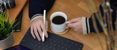 Cropped shot of female freelancer right hand typing on digital tablet keyboard and left hand holding coffee cup on worktable