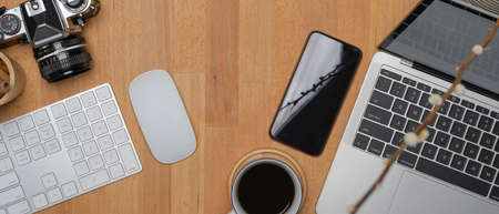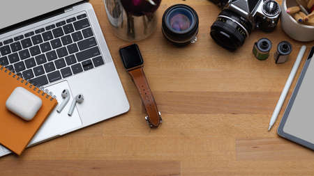 Top view of workspace with digital devices, camera, accessories and copy space on wooden table