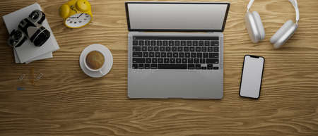 3D rendering, laptop and smartphone with mock-up screen on wooden table with coffee cup and supplies, 3D illustration