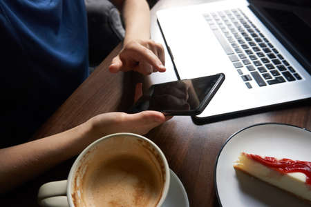 Business woman working in a cafe, business woman with phone, cheesecake, coffee mug.