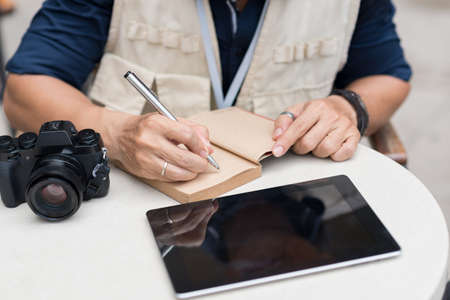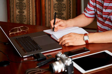 Close-up of photographer sitting at the table among wireless gadgets and writing a list of new orders from his clients in notepad