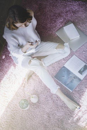 Beautiful woman sitting on pink carpet on the floor at modern light coloured living room and holding smart phone hand.Vertical