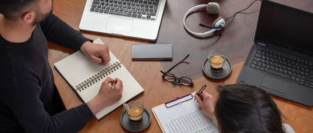 Business people sitting at the office desk using laptop, man and woman working together. Teamwork, modern creative office concept, above view, banner