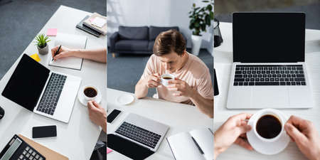 Collage of man holding cup and taking notes near stationery and smartphone on table, earning online concept