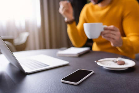cropped view of freelancer holding cup of coffee near smartphone with blank screen, blurred background
