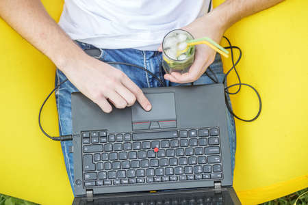 Laptop keyboard and mojito cocktail in male hands. top view.