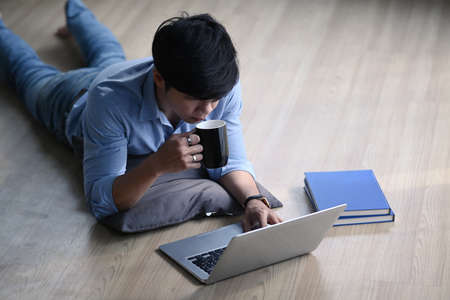 Casual man lying on wooden floor drinking coffe and working on laptop computer.