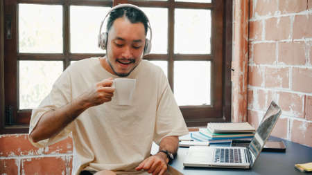 Freelance Asia guy with beard drinking coffee and working on laptop in living room at house in the morning. Working from home, remotely work, social distancing, quarantine for coronavirus prevention.