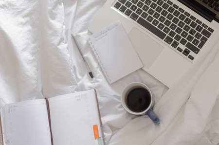 A high angle shot of a laptop, calendar notebook, cup of coffee notebook with a pen isolated on a bed