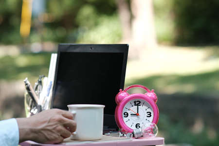 A woman's hand is holding a cup of coffee and a laptop on a table in the park.