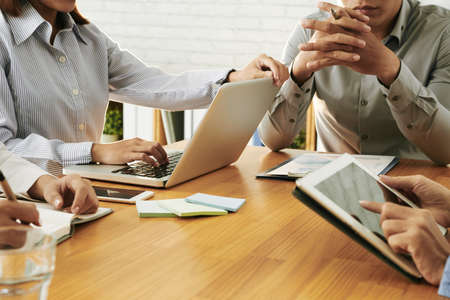 Colleagues working together in modern office using devices and gadgets during creative meeting
