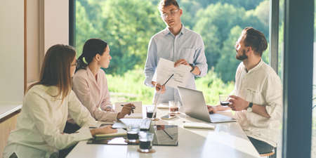 Startup Teamwork Brainstorming Planning Meeting Concept. Multiethnic startup business team on meeting in modern bright office interior.