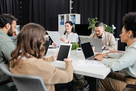 Mixed races coworkers analysing different business papers and working with computers at the tables in modern office.