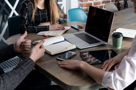Freelancer with thumbs up hands sitting with colleagues at the table with open laptop computer with empty screen with space for your advertising content. Workstation with net-book, textbook and tools