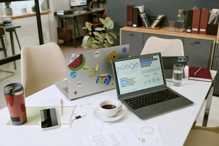 Two laptops with business analytics charts on screens sitting on office table surrounded by coffee cup, water glass, smartphone, documents