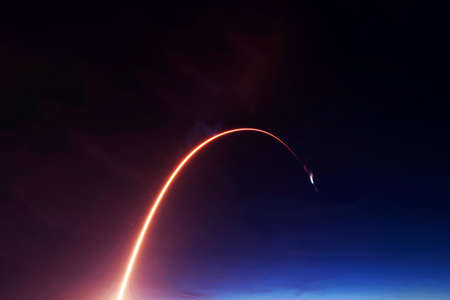 Space rocket launch into the starry sky. Space shuttle with blast and blast lift off into space on a dark background. Successful start, concept