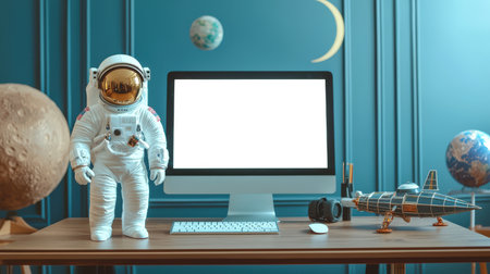 A mockup of a modern computer monitor in the astronaut's room. On the table there is a computer monitor, a toy astronaut, a model of a rocket, the moon and the earth. The concept of celebrating Cosmonautics Day