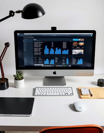 Modern workspace with computer, supplies and decorations. 3d rendering.