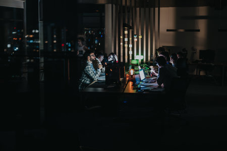 A group of professionals engages in a brainstorming session in a modern office. Laptops, notepads, and a small plant decorate the wooden table, fostering a productive atmosphere.