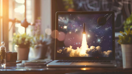 Laptop screen on an office table with a rocket launching, symbolizing the growth and innovation of startups