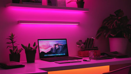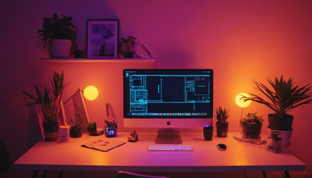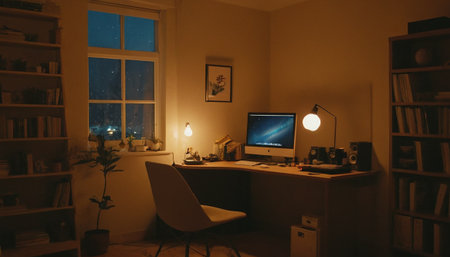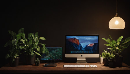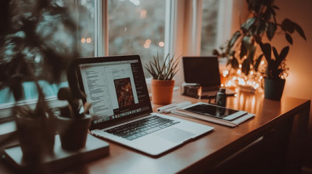 A cozy home office workspace featuring a laptop, potted plants, and warm lighting that creates an inviting atmosphere for productivity and creativity.