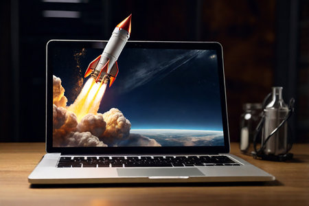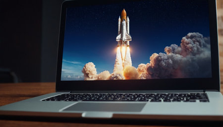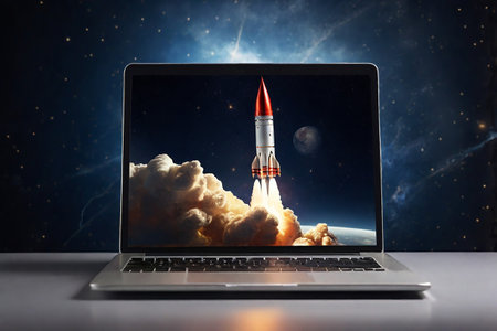 A Success takes flight as rocket launches from laptop screen under starry sky, symbolizing innovation, winner spirit, and victory in technology