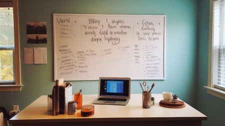 A vibrant workspace featuring a laptop surrounded by notes, calendars, and various documents, creating an inspiring environment for creativity and productivity.