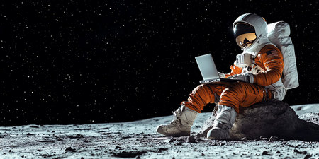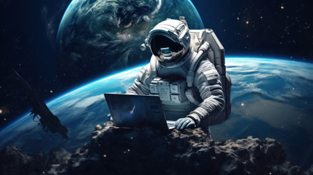 Astronaut working on a laptop in space, floating above a rocky surface with Earth and another celestial body in the background. Ideal for technology and space exploration themes.