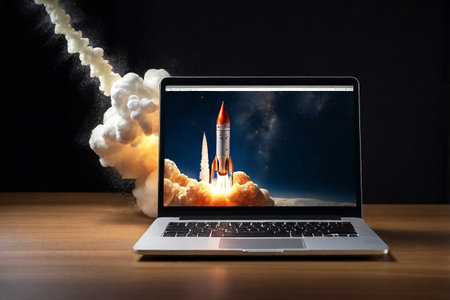 Rocket coming out of a laptop screen on a wooden desk with a black background