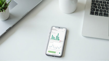 A modern smartphone shows financial app data with colorful charts and graphs, placed next to a notepad and lush green plants, creating a fresh office vibe.