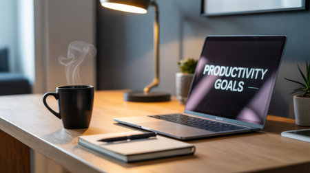 A laptop screen displays Productivity Goals next to a steaming mug of coffee and a notebook.