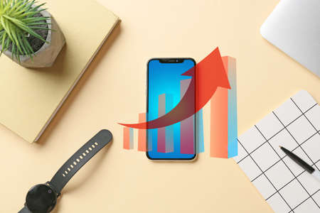 Mobile phone with digital diagram on light background. Concept of marketing strategy